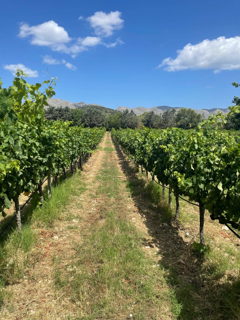 Varasin vierailun viinitilan omilta nettisivuilta. Sivuilta pystyy ostamaan kierroksen viinitilalla, joka sisältää viininmaistelun ja tapakset tai pelkän viininmaistelun tapaksineen. Osallistuimme opastetulle kierrokselle, joka avasi meille viininviljelyn salaisuudet ympäristöstä aina viinikellariin asti. Ensimmäinen viinitarha istutettiin vuonna 1996, ja sen tavoitteena oli herättää henkiin viininviljelyn historiallinen perintö saarella. Viinitarhassa ihailimme viiniköynnöksiä ja rypäleitä, jotka odottivat sadonkorjuuta. Maaperän runsas kalkkisuus ja savisuus antavat viineille hyvän maun.