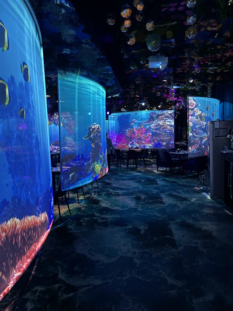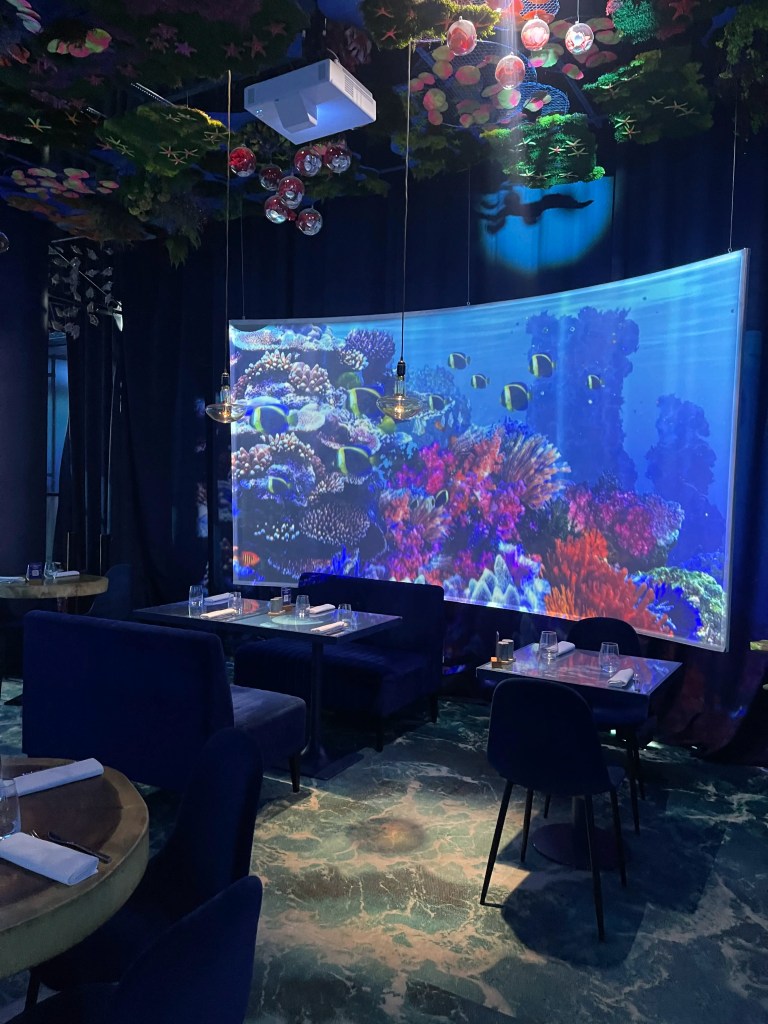 Koe erilainen ravintolakonsepti ja sukella vedenalaiseen maailmaan. Ravintolassa on paljon valkokankaita, joihin on heijastettu merenalaista maailmaa. Ruoka ei itsessään ollut kovin erikoista, mutta elämys oli hauska!