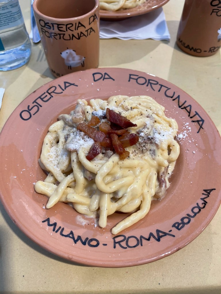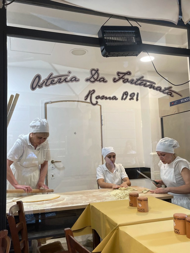 Jos olet italialaisen ruoan ystävä ja haluat kokea autenttista roomalaista tunnelmaa ja makuja, Osteria da Fortunata on ehdottomasti vierailun arvoinen paikka. Ravintola on erittäin suosittu niin turistien kuin paikallisten keskuudessa, joten pöytävaraus on suositeltavaa, etenkin viikonloppuna. Paikka on kuuluisa tuoreista käsintehdyistä pastoistaan, jotka valmistetaan paikan päällä. Samalla kun nautit herkullisesta ja tuoreesta pastasta voit samalla katsella, miten pasta valmistetaan alusta loppuun saakka. Pasta-annos maksaa n. 18-20€.